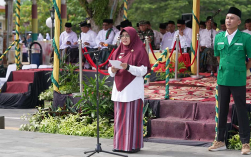 Siak (BM) – Bupati Siak, Dr. Afni Zulkifli, memimpin upacara peringatan Hari Santri Nasional (HSN) tingkat Kabupaten Siak di Lapangan Siak Bermadah, Senin (27/10/2025). Dalam upacara tersebut, Afni tampil mengenakan sarung, mengikuti tradisi santri yang menjadi simbol kesederhanaan dan religiusitas.