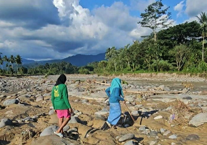 Keluarga korban banjir badang di Sumatera Barat, saat melakukan pencarian Ipda Angga Mufajar di aliran Sungai Lambah Anai, Minggu (14/12/2025).