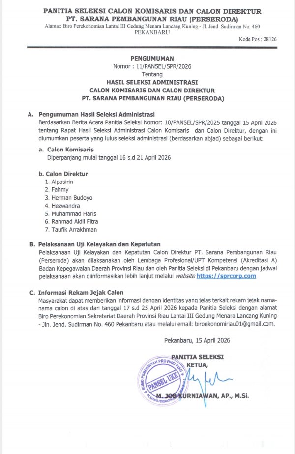 Pekanbaru (BM) – Panitia Seleksi (Pansel) Calon Komisaris dan Calon Direktur PT Sarana Pembangunan Riau (Perseroda) resmi mengumumkan hasil seleksi administrasi. Pengumuman ini tertuang dalam surat Nomor: 11/PANSEL/SPR/2026 yang ditandatangani oleh Ketua Pansel, M. Job Kurniawan, pada Rabu (15/4/2026).
